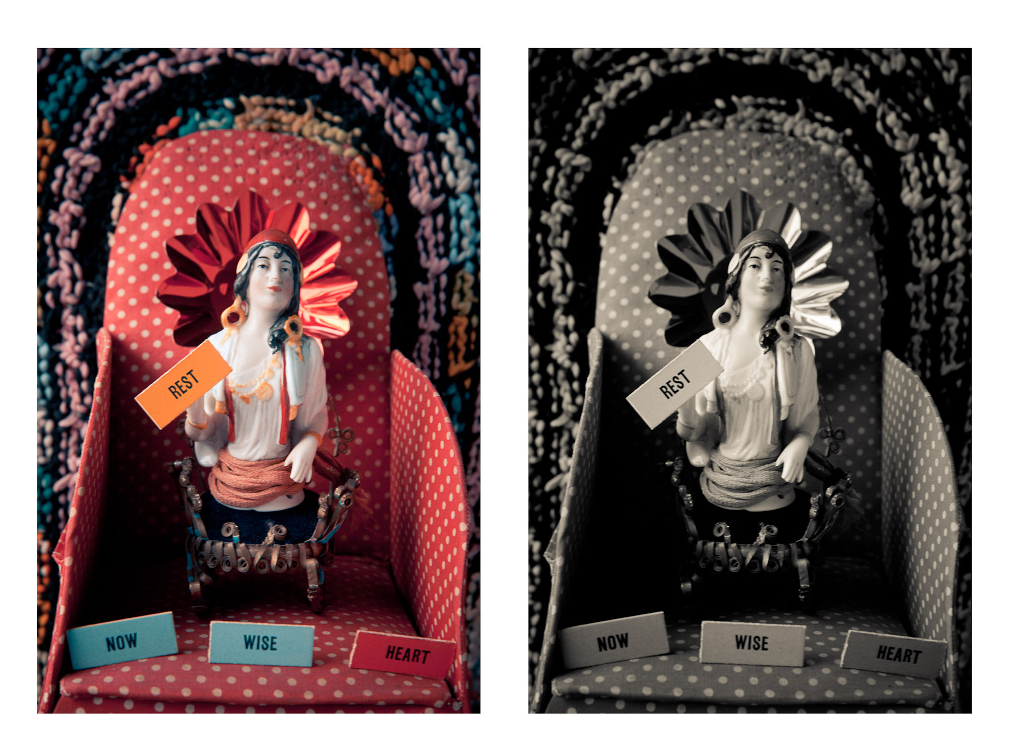 More blatant bloggy laziness…can’t decide about my own image, so today I am throwing myself on the mercy of the crowd (you dear, kind souls who have made it your business to visit the blog despite its self-indulgency, and to throw me kisses which I catch and pocket smooch smooch smooch). Which gypsy fortune teller do you prefer? The hot red lady who glows with color wherever she pleases, or color abandoned for the uncompromising gleam of black and white?