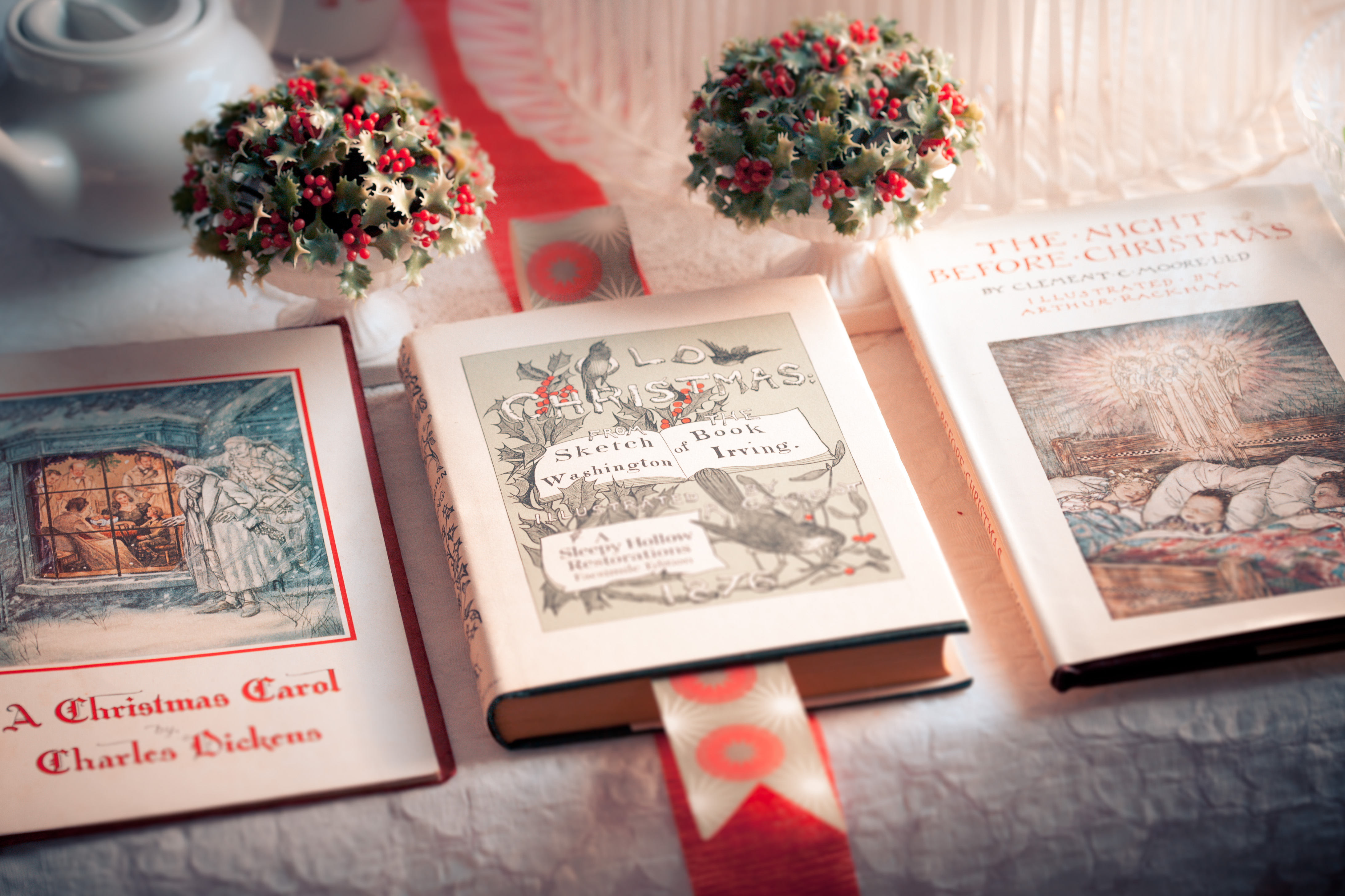 From left to right: A Christmas Carol, by Charles Dickens. Illustrator uncredited, seasonal promotion circa 1930 for Clyde’s Jewelry Shop, Green Bay, WI. Old Christmas: A Sketchbook, illustrated by R.Caldecott. Sleepy Hollow Restorations; Night Before Christmas, Clement C. Moore, illustrated by Arthur Rackham. Weathervane Publishing, 1976.