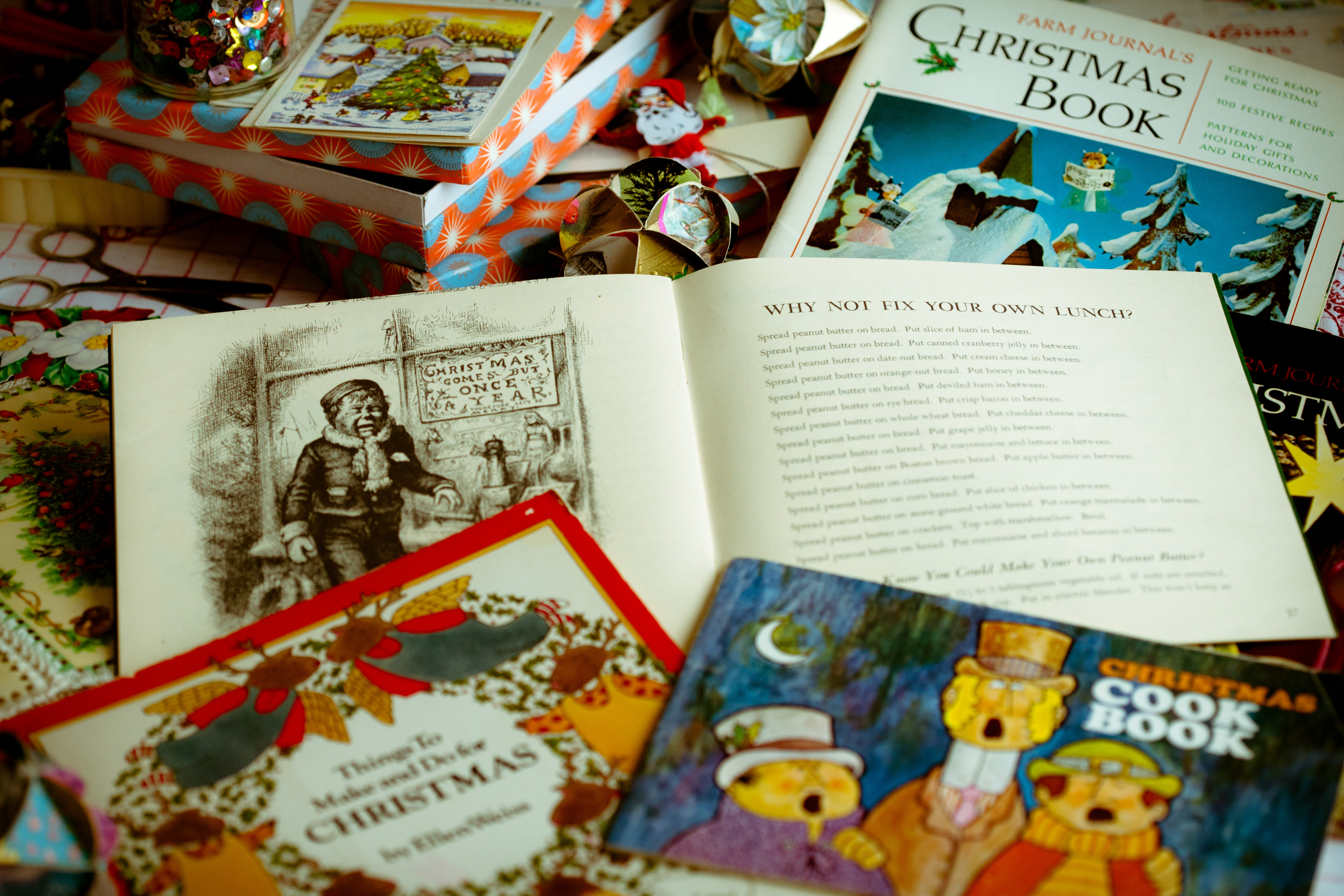 Top: Farm Journal Christmas Book 1965 & 1968 Center: A Child’s Christmas Cookbook, commissioned by the Denver Art Museum, written by Betty Chancellor, designed by Kay Obering, Illustrations by Thomas Nast. Evergreen Press, Walnut Creek, CA. Bottom: Things to Make and Do for Christmas, by Ellen Weiss. Franklin Watts, Inc. 1980. Christmas Cookie Cookbook, circa 1975.