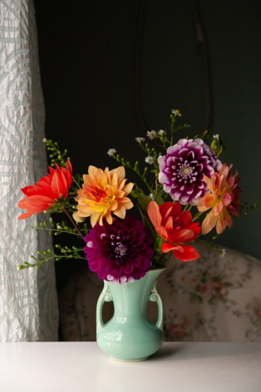 I love the dahlias.  The lipstick colors, gratuitous petals and thick, expressive stems – it’s like God gave their blossoms a boob job.  I mean, you can’t help but stare.  And wonder what they’d look like in your little green vase.
