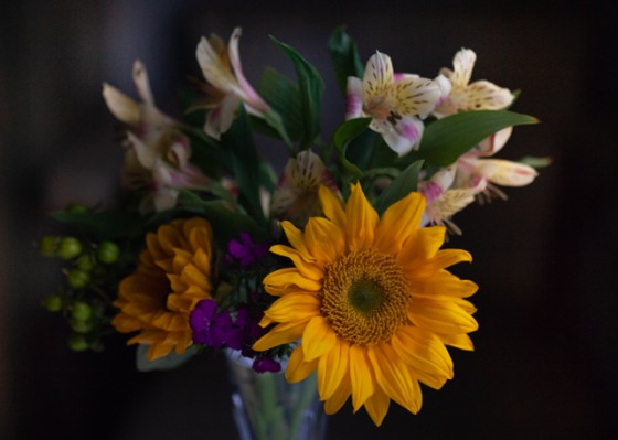 The shutter failed on the camera this afternoon, so for now the flowers I bought today are for my personal edification only.  I found some real beauties this week – new shapes to wonder at and get to know.  Pink-shelled calla lilies, thistles topped with puffs of golden orange needles, and olive twigs still bending to the wind they grew in, all plunked together with twists of alstroemeria and the dark-eyed punch of sunflowers.  The tea pot and white pitcher are full, and the tarnished Hilton coffee pot found its place, too.