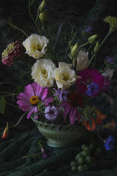 Here are zinnia and nasturtium, and cornflower and petunias and hard, immature grapes as opaque as jade. Echinacea and lisianthus, the Prairie Rose – who folds as many petals in her skirt as any spring ranunculus, buds curled high along her serpentine stem, and ready to unwind their treasure.