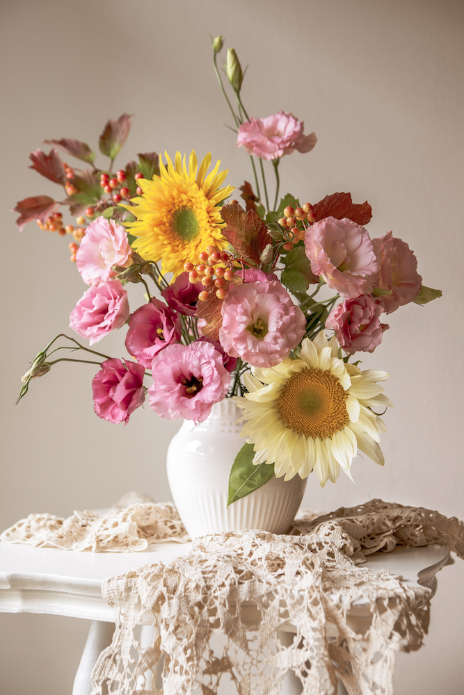 There’s corn this week, and the tomatoes are run amok. The dark red wash on the viburnum leaves and berries hints at autumn. Lisianthus keeps coming, in all her ruffles and gingerly folds. Why ever would you say “no?” to such a fun party girl? It rained too hard this morning for me to get into my community plot – but I know the cosmos are there, taking over everything.