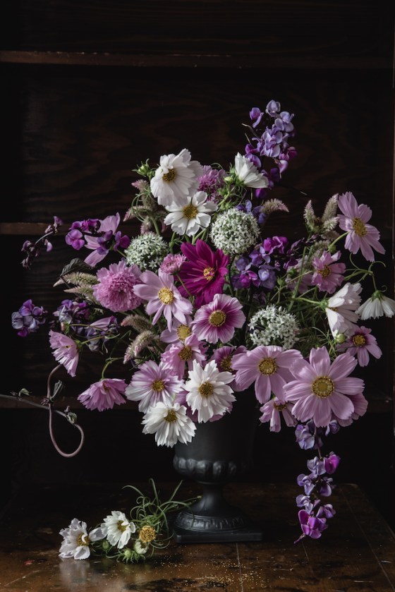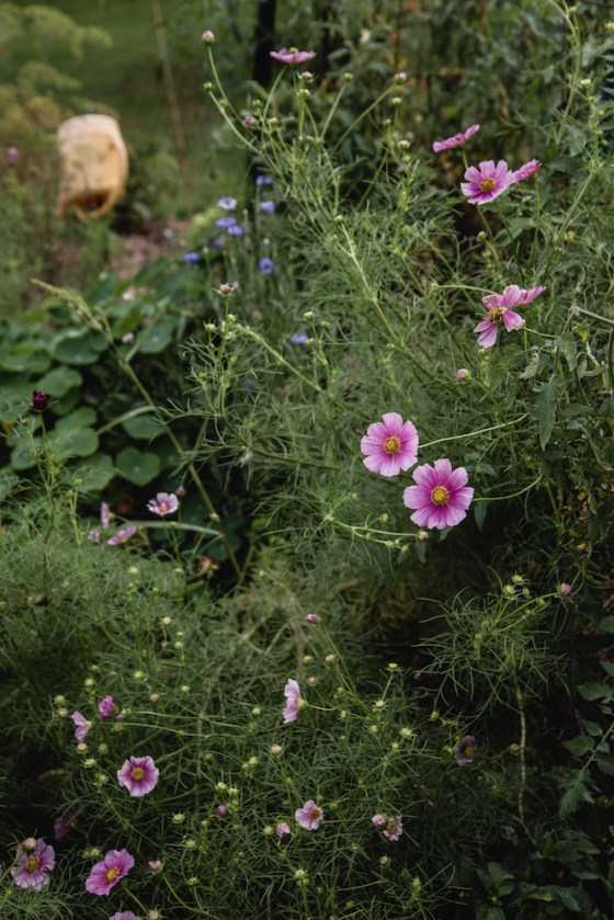 Well, the cosmo skyscrapers finally tumbled to earth this week. Weighted down with soggy spent blossoms, the rain-weakened stems tilted and sagged across each other like a mushy crop circle. I admit, I’m to blame. Creative neglect usually passes a point of no return – and I know this. I could have staked up the leaning mass of stems and flowers. (And I probably will this week while I’m staycating.) But honestly, they were so rambly-shambly already, I didn’t think things could get any worse. I didn’t realize further toppling was possible.