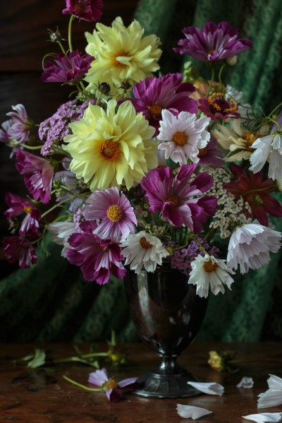 Meanwhile: the luminous dahlia, the fragrant yarrow, the dance of the cosmos. All from seed planted this spring. Forgive me for such a short and silly post tonight. I got started late – and anyway what can I say that the cosmos don’t already tell?