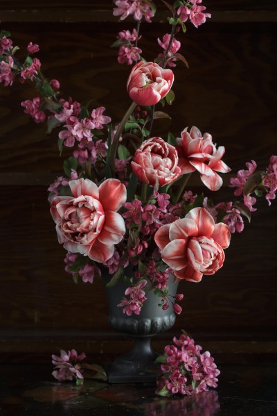Oh darling, so stunning! If this is what your work looks like in your new place, all I can say is, can’t wait for more. It’s got this porcelain quality to it, the tulips the crabapples. So pink, so beautiful. Love you, honey!