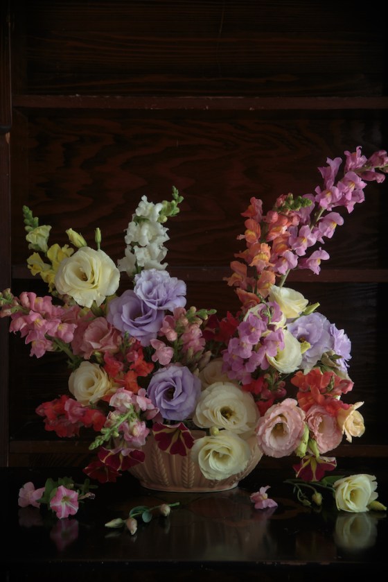 The lisianthus and the snapdragons were all blooming today, and I scooped up as many as I could, along with a few patio petunias that I cut back hoping to encourage some new buds. I spent $150 on these seedlings, and I am not sorry at all. If I hadn’t splurged, I’m not sure I’d have any flowers at all. The heavy rain drowned all the seeds I planted, except the calendula for some reason, and the starts I sprouted indoors have not fared too well in the soggy soil. Slugs and bunnies – take your pick – had their feast on the tender leaves before the roots could catch up and fight back. Ah well – circle of life, you know.