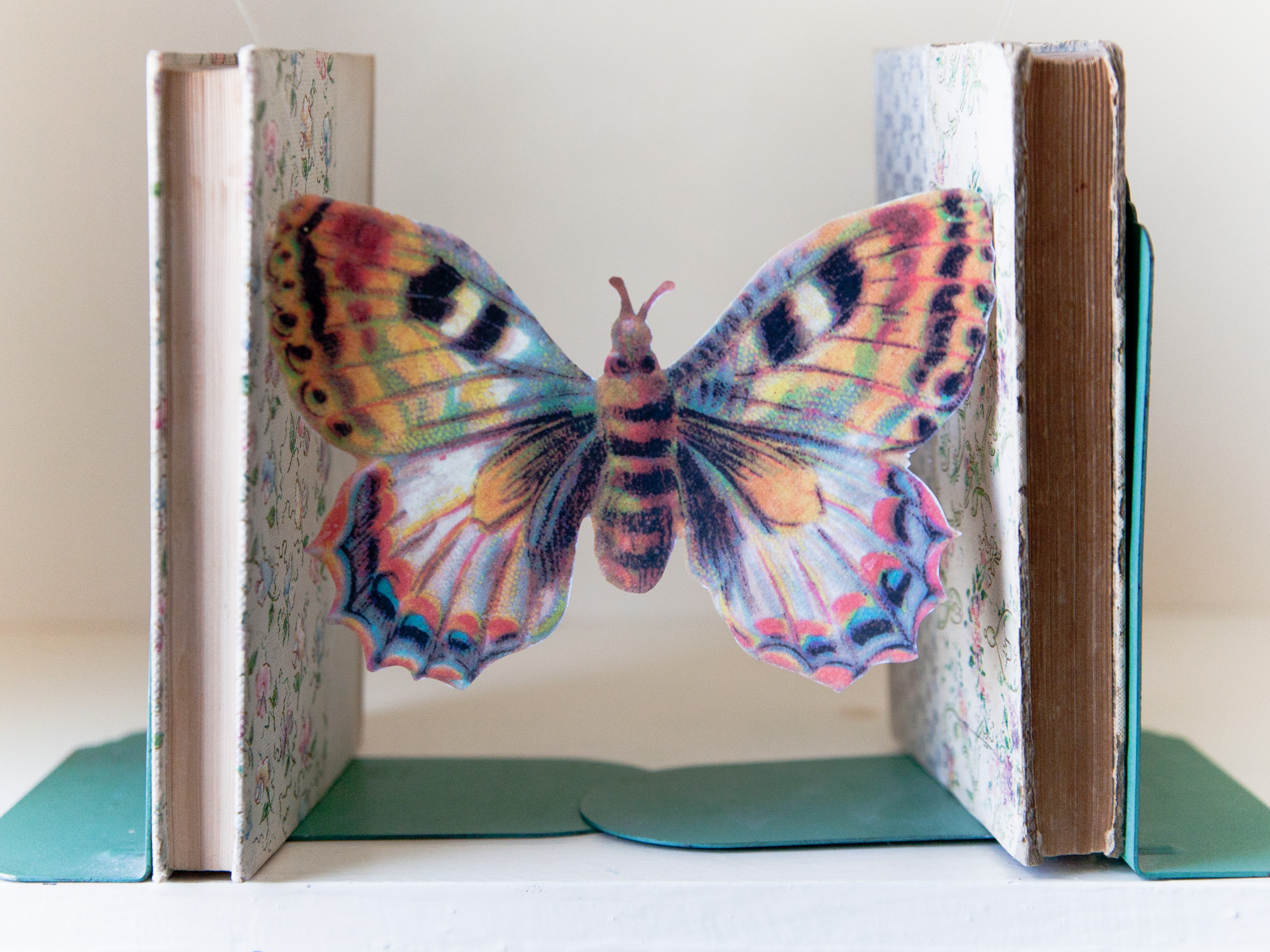Between the bookends, there has always been a butterfly balanced.  It’s like me focus on the rigid and unyielding elements of the story;  maybe you think that way, too.  But that hasn’t meant the butterfly wasn’t there, becoming and changing, continually unfolding.  Lately I am taking little peeks into the tender, iridescent wing-like pages.  What do I have to lose?
