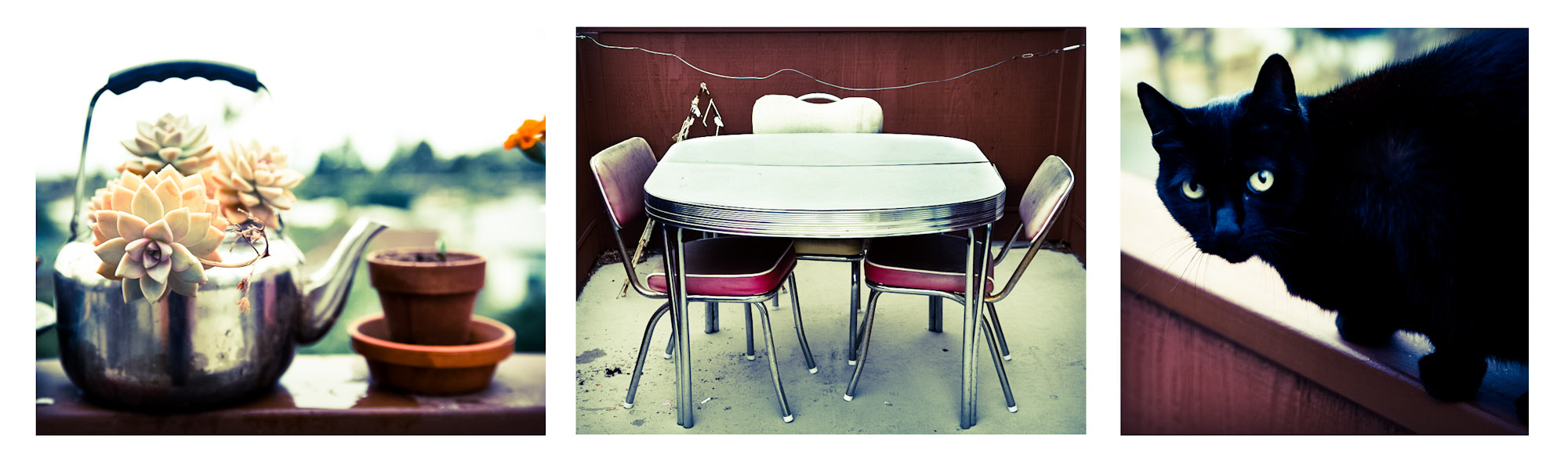 Leslie, my San Francisco Hostess, has a pretty amazing view of the Golden Gate bridge from her porch. However, I tend to find the shiny things close by make better souvenir pictures. It was too chilly for morning coffee outdoors, but the kitty didn’t mind at all. Tune in tomorrow for more views of Leslie’s garden…